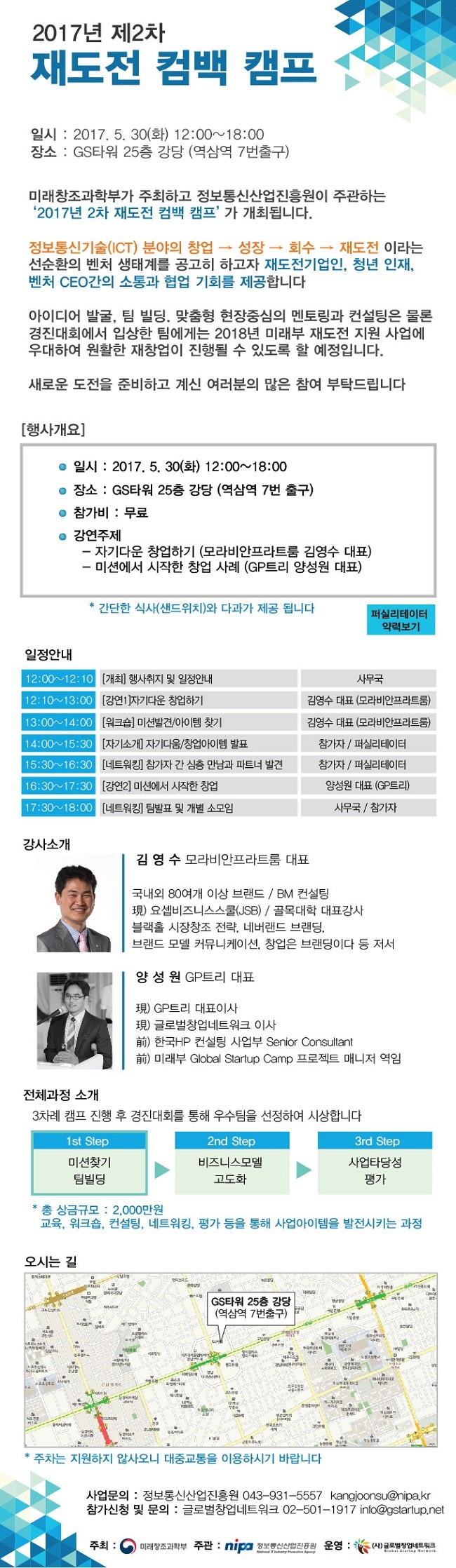 미래창조과학부에서 개최하는 'K-Global Re-Startup 컴백 캠프'가 2017년 5월 30일 낮 12시 부터 오후 6시까지 GS타워 25층 강당에서 열립니다. 이번 행사는 정보통신기술 분야 벤처 생태계를 구축하기 위한 것으로, 벤처 CEO와의 소통과 협업 기회를 제공하는 행사입니다. 모교에서는 황문기(85 물리) 서강기업가정신센터 교수가 퍼실리테이터로 참여합니다. 많은 관심 부탁드립니다.
