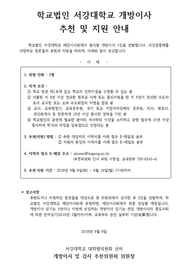 서강대 개방이사 공개모집, 추천 및 지원 안내 > 알림마당