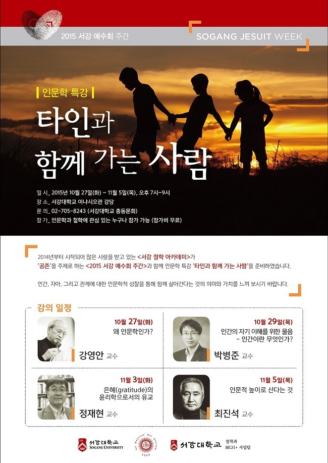 서강대 재단과 철학과는 10월 27일부터 11월 5일까지 네차례에 걸쳐 인문학 대중강연을 개최합니다. '타인과 함께 가는 사람'을 주제로 했으며, 모교 철학과 강영안, 박병준, 정재현(81 철학), 최진석(79 철학) 교수가 인간, 자아, 그리고 관계에 관한 인문학적 성찰을 펼치는 강연을 진행합니다.