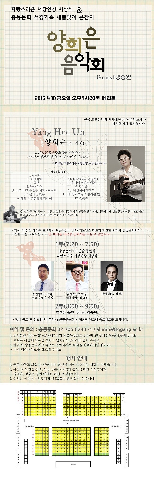 양희은과 함께 하는 서강동문 봄맞이 큰잔치 페이지 정보 작성자 관리자 작성일15-03-06 10:08 조회14,489회 댓글0건 관련링크 프린트 목록 본문 아래는 양희은 동문과 강승원 동문이 함께 한 공연 영상입니다. 기대하셔도 좋습니다. 댓글목록 등록된 댓글이 없습니다. 프린트 목록