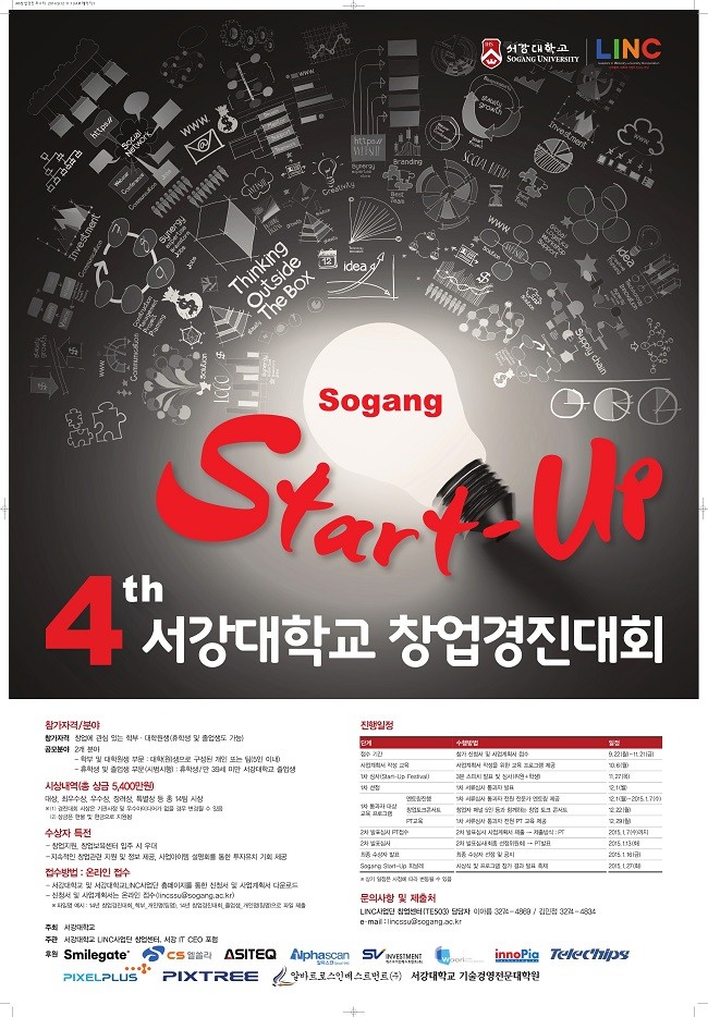 제4회 서강대학교 창업경진대회 페이지 정보 작성자 관리자 작성일14-09-23 10:25 조회11,117회 댓글0건 관련링크 프린트 목록 본문 * 자세한 내용은 첨부파일 '2014년_제4회_서강대학교_창업경진대회_모집공고.hwp'를 참조해 주십시오. 댓글목록 등록된 댓글이 없습니다. 프린트 목록