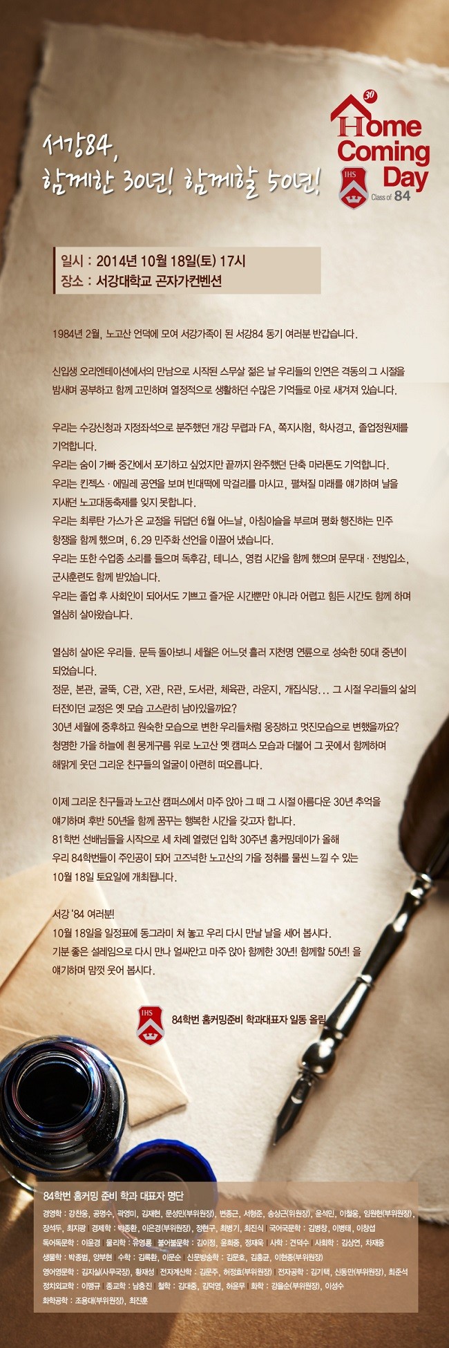 84학번 입학 30주년 홈커밍데이 초청장