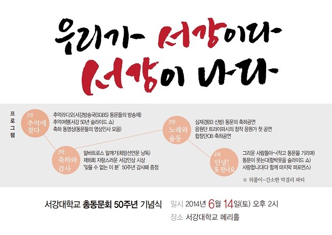 서강대학교 총동문회가 2014년 개회 50주년을 맞았습니다. 반세기 동안 동행한 서강가족들이 한데 모이는 뜻 깊은 자리에 귀하를 초대합니다.